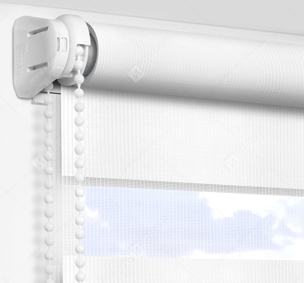 Рулонные шторы Зебра работают следующим образом: полоски ткани смещаются так, чтобы совпали светлые или темные слои, образуя, плотное или более прозрачное полотно. Так обеспечивается ночной или дневной режим затемнения. Также можно поднять шторное полотно полностью, открывая окно. По умолчанию - цвет фурнитуры белый.