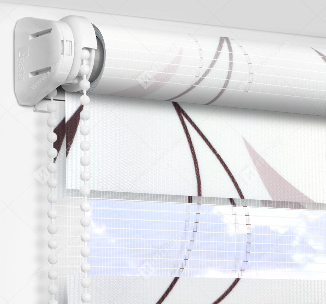 Рулонные шторы Зебра работают следующим образом: полоски ткани смещаются так, чтобы совпали светлые или темные слои, образуя, плотное или более прозрачное полотно. Так обеспечивается ночной или дневной режим затемнения. Также можно поднять шторное полотно полностью, открывая окно. По умолчанию - цвет фурнитуры белый.
