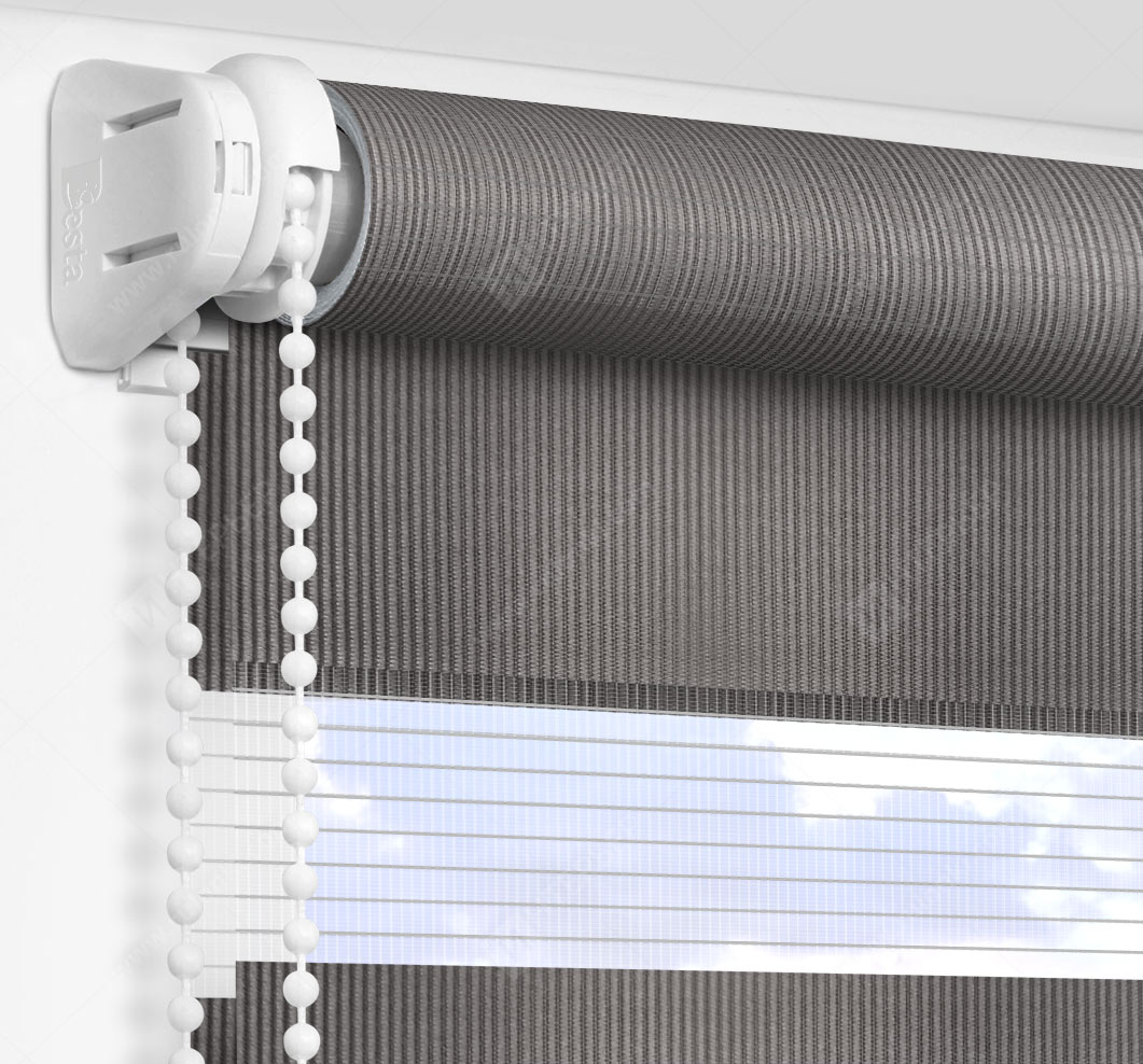 Рулонные шторы Зебра работают следующим образом: полоски ткани смещаются так, чтобы совпали светлые или темные слои, образуя, плотное или более прозрачное полотно. Так обеспечивается ночной или дневной режим затемнения. Также можно поднять шторное полотно полностью, открывая окно. По умолчанию - цвет фурнитуры белый.