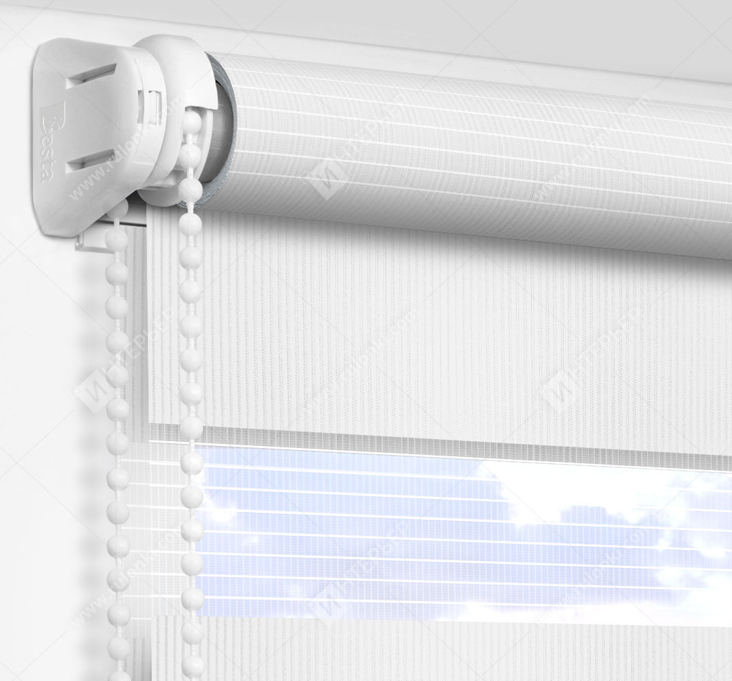 Рулонные шторы Зебра работают следующим образом: полоски ткани смещаются так, чтобы совпали светлые или темные слои, образуя, плотное или более прозрачное полотно. Так обеспечивается ночной или дневной режим затемнения. Также можно поднять шторное полотно полностью, открывая окно. По умолчанию - цвет фурнитуры белый.
