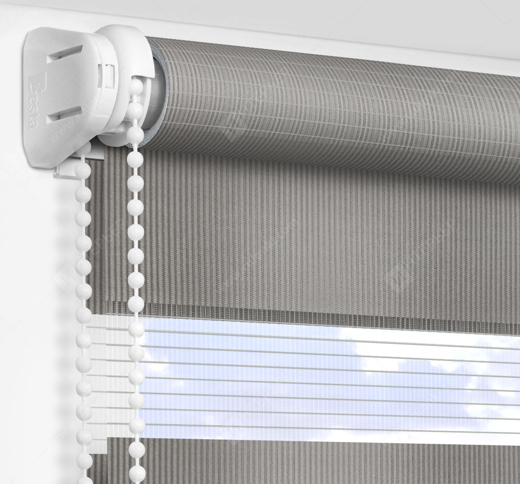 Рулонные шторы Зебра работают следующим образом: полоски ткани смещаются так, чтобы совпали светлые или темные слои, образуя, плотное или более прозрачное полотно. Так обеспечивается ночной или дневной режим затемнения. Также можно поднять шторное полотно полностью, открывая окно. По умолчанию - цвет фурнитуры белый.