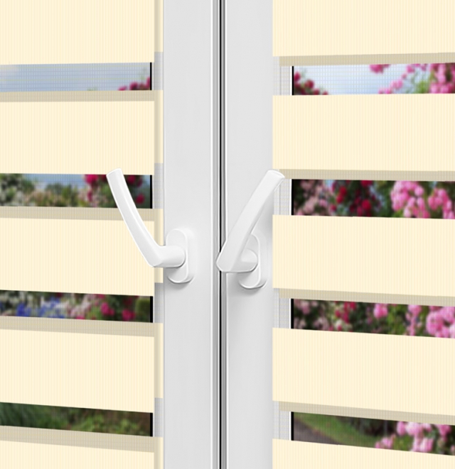 Рулонные шторы Зебра работают следующим образом: полоски ткани смещаются так, чтобы совпали светлые или темные слои, образуя, плотное или более прозрачное полотно. Так обеспечивается ночной или дневной режим затемнения. Также можно поднять шторное полотно полностью, открывая окно. По умолчанию - цвет фурнитуры белый.