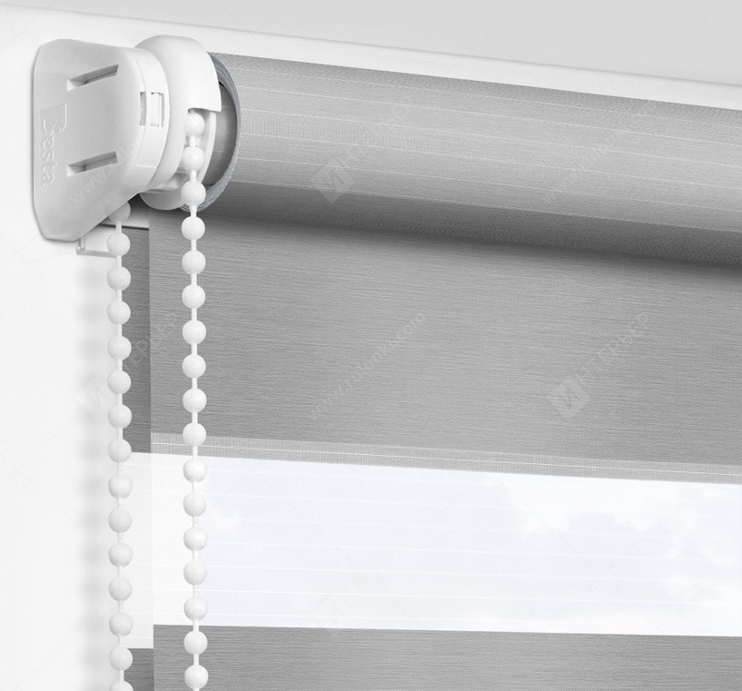 Рулонные шторы Зебра работают следующим образом: полоски ткани смещаются так, чтобы совпали светлые или темные слои, образуя, плотное или более прозрачное полотно. Так обеспечивается ночной или дневной режим затемнения. Также можно поднять шторное полотно полностью, открывая окно. По умолчанию - цвет фурнитуры белый.