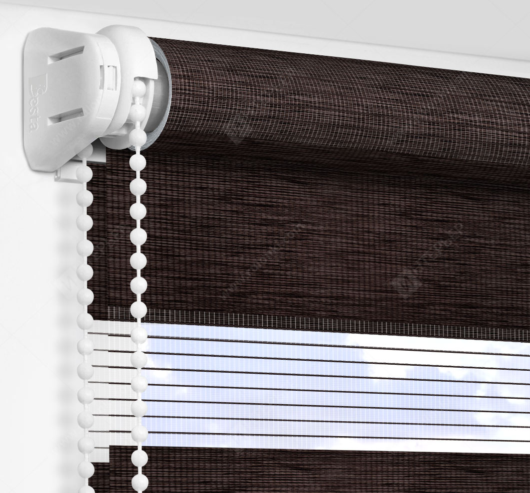 Рулонные шторы Зебра работают следующим образом: полоски ткани смещаются так, чтобы совпали светлые или темные слои, образуя, плотное или более прозрачное полотно. Так обеспечивается ночной или дневной режим затемнения. Также можно поднять шторное полотно полностью, открывая окно. По умолчанию - цвет фурнитуры белый.