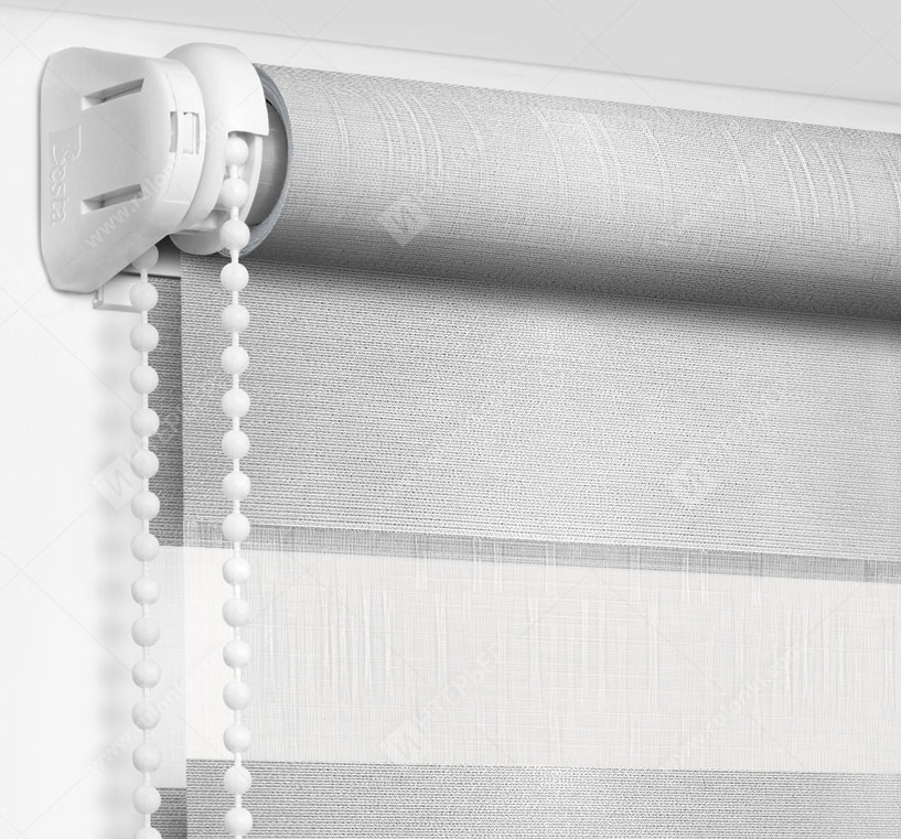 Рулонные шторы Зебра работают следующим образом: полоски ткани смещаются так, чтобы совпали светлые или темные слои, образуя, плотное или более прозрачное полотно. Так обеспечивается ночной или дневной режим затемнения. Также можно поднять шторное полотно полностью, открывая окно. По умолчанию - цвет фурнитуры белый.